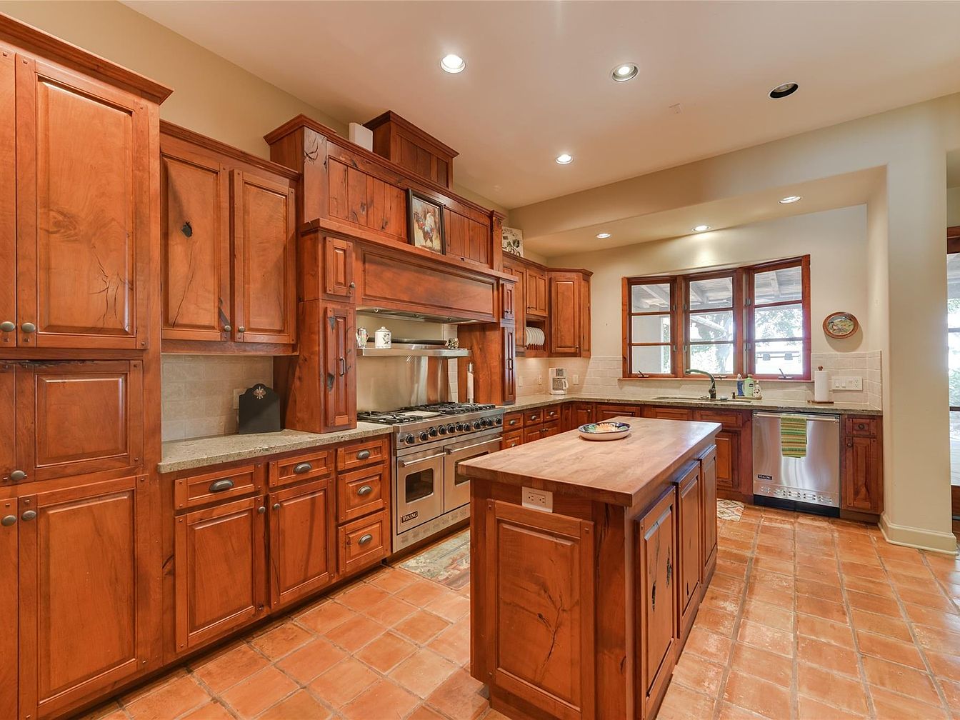 Warm wood cabinetry and a matching island anchor this spacious kitchen, complemented by natural terracotta floors that offer both style and durability for family life. The kitchen is centered around a professional-grade range with ample counter space for meal prep and family gatherings. Large windows above the farmhouse sink flood the space with natural light, creating a welcoming environment. Earthy tones throughout the cabinetry, backsplash, and flooring promote a cozy, inviting feel. The functional layout with plenty of storage, easy-to-clean surfaces, and generous workspace makes this kitchen ideal for cooking with kids or hosting family events.