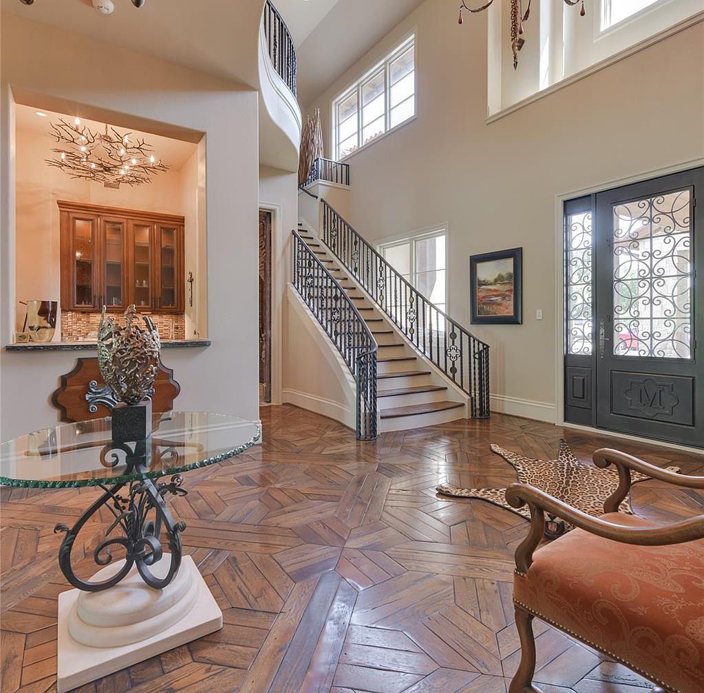A soaring, light-filled foyer welcomes guests with classic elegance. The space features striking herringbone-patterned wood flooring, intricate ironwork on the main staircase and entry doors, and a double-height ceiling that bathes the area in natural light. The glass-topped table with ornate iron legs adds a touch of artistry, while an inviting upholstered chair signals comfort. Earthy neutrals and warm wood tones create a welcoming palette suitable for families. Large windows illuminate the open layout, and the sightline into a warm, modern kitchen speaks to both entertaining and practical living. Fine details, including the dramatic chandelier, elevate the entry’s sophistication.
