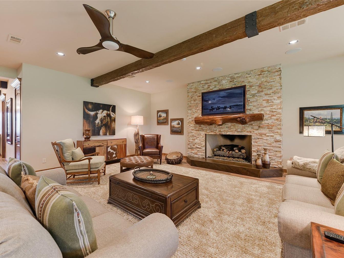 Warm and inviting living room designed with rustic charm and family comfort in mind. The space features neutral tones with beige walls and a textured, plush carpet for cozy gatherings. A striking wooden ceiling beam and a stone accent fireplace add architectural interest, while a live-edge mantel anchors the room. The furniture includes overstuffed sofas with earth-toned, patterned pillows and comfortable armchairs, offering ample seating. Natural wood finishes on the coffee table and sideboards enhance the country-inspired aesthetic. Thoughtful touches like nature-themed artwork and soft lighting from a floor lamp create a welcoming, family-friendly atmosphere perfect for relaxation or entertaining.