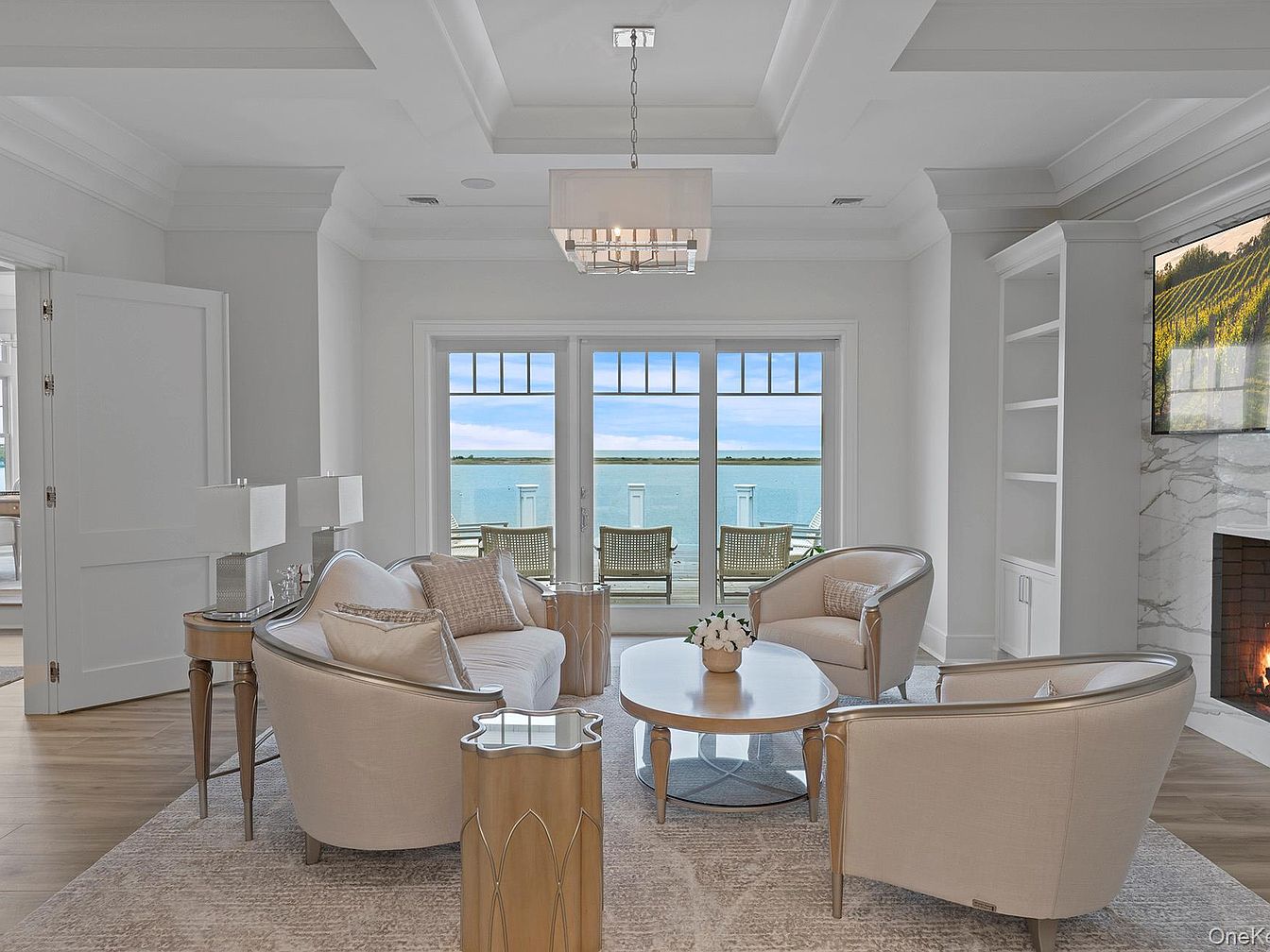 An airy living room offers a serene ambiance with soft neutral tones, featuring a pair of elegant armchairs and a plush sofa grouped around a round wooden coffee table. Windows and glass doors frame a stunning water view, inviting natural light that makes the space feel open and inviting. The coffered ceiling and detailed crown molding lend architectural interest, while a modern chandelier and stylish side tables provide refined touches. A marble fireplace and built-in shelving add warmth and storage. This welcoming, uncluttered layout is ideal for family gatherings, conversation, and relaxing together after a day by the water.