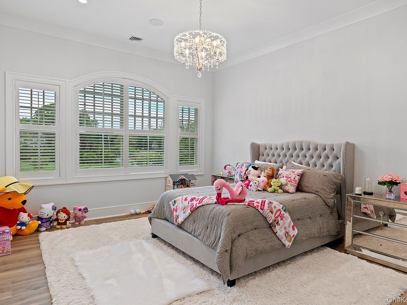 A bright, welcoming children’s bedroom features a large upholstered bed adorned with a playful collection of stuffed animals and vibrant bedding. The room is bathed in natural light streaming through expansive arched windows with classic white shutters, creating an airy and cheerful space. Polished wooden floors are softened by plush white rugs for a cozy, family-friendly touch, perfect for playtime. Refined touches like the sparkling chandelier, mirrored nightstand, and soft grey palette give the room a sophisticated yet youthful atmosphere, while the display of toys along the window wall ensures this space feels both personal and inviting for any child.
