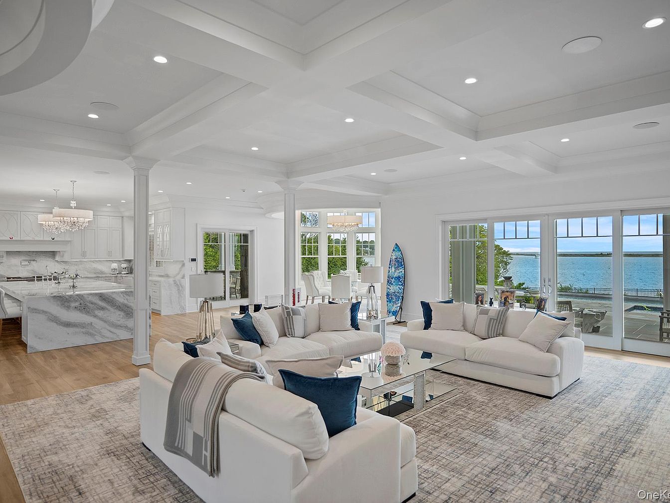 This open-concept living area features a seamless flow between the spacious kitchen, dining, and lounge spaces. The soft white palette is complemented by navy and gray accents, creating a welcoming and tranquil environment. Sleek white sofas with cozy throws and plush pillows invite family gatherings and relaxation, while large windows and glass doors flood the room with natural light and provide breathtaking views of the water. The kitchen, adorned with marble countertops and a statement chandelier, is both stylish and functional for family meals. Architectural columns, tray ceilings, and subtle patterned rugs complete this sophisticated, family-friendly retreat.
