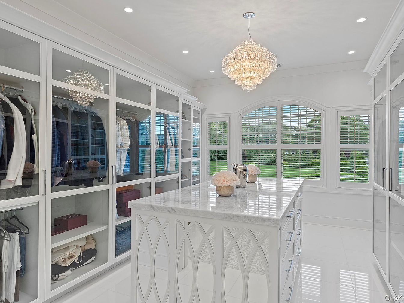 This luxurious walk-in closet features custom-built cabinetry with clear glass doors, providing an elegant way to display and organize clothing while keeping everything tidy and accessible. The centerpiece is a marble-topped island with intricate decorative side panels, offering plentiful drawer storage for accessories. Stunning crystal chandeliers create a glamorous focal point, while recessed lighting adds a bright, inviting ambiance. Large arched windows with white plantation shutters allow natural light to flood the space, enhancing the crisp white palette and serene atmosphere. Modern finishes and attention to detail make this closet both functional and family-friendly, encouraging organization and ease for all ages.