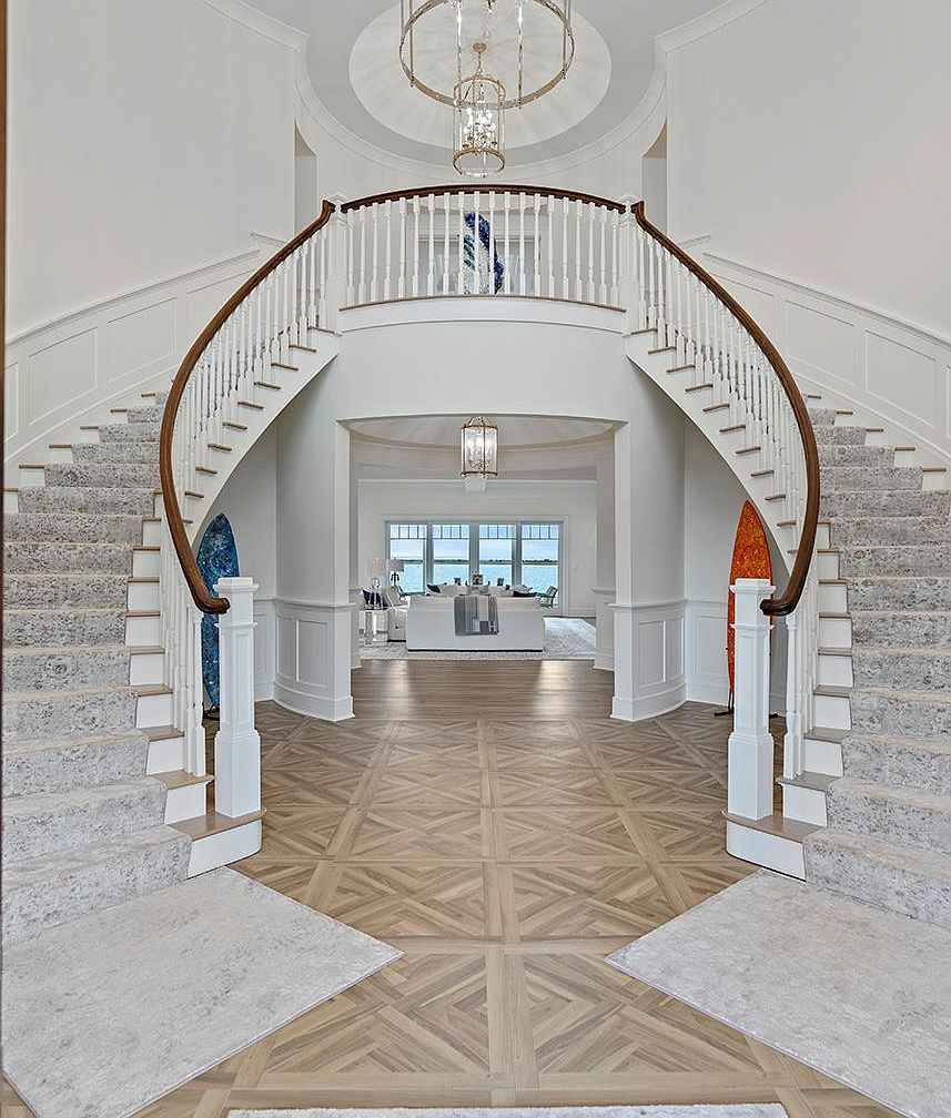 A dramatic double staircase with elegant white spindles and rich wooden handrails sweeps upward to a beautifully crafted landing, framing a spacious and airy foyer. The open floor plan flows seamlessly with natural light, drawing guests into the main living space ahead. Soft neutral tones, such as creamy whites and subtle grays, create a calming ambiance, while intricate parquet flooring adds depth and refinement. Large chandeliers suspended from a domed ceiling add a luxurious touch. This welcoming space is perfect for families, offering both functionality and style with its open, uncluttered layout and graceful architectural details.