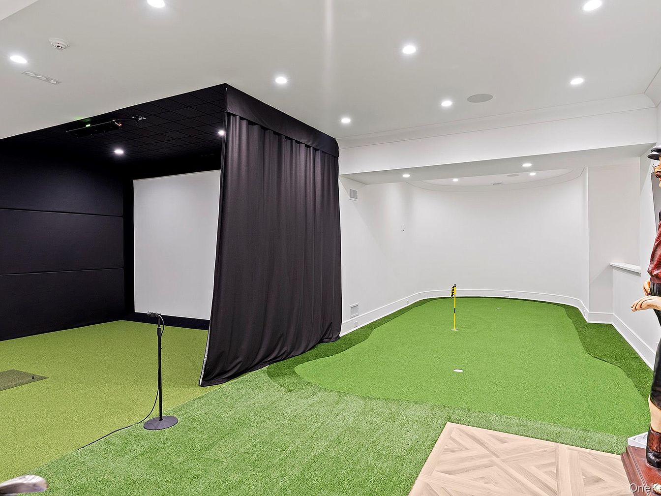 A spacious and modern indoor golf simulator room designed for both fun and practice. The artificial green stretches across the floor, providing ample space for putting, while a full-size golf simulator occupies one side behind a sleek black curtain, offering a high-tech virtual golfing experience. Recessed ceiling lights evenly illuminate the room, and crisp white walls enhance the clean, open feel. The layout encourages family use, with plenty of room to play and move around safely. Subtle architectural features, such as beveled edges and a curved alcove, add polish to this unique and playful recreation area.