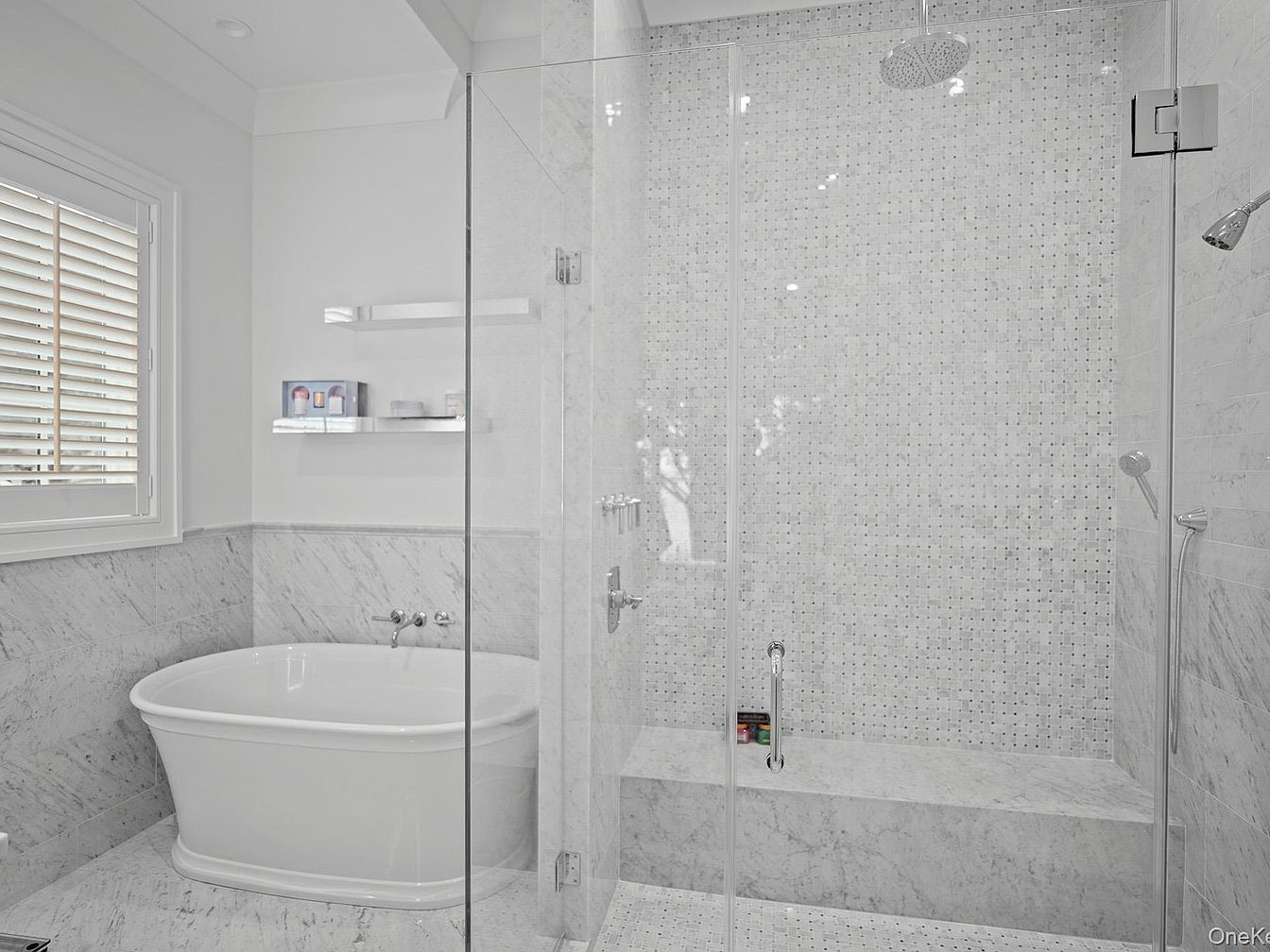 A sleek, spa-inspired bathroom featuring a luxurious freestanding soaking tub next to a wide window with plantation shutters for privacy and natural light. The large walk-in shower is enclosed in clear glass and flaunts elegant marble walls and a mosaic tile accent. A rain showerhead and handheld sprayer provide versatile showering options, while a built-in bench enhances comfort and accessibility for family members of all ages. Floating shelves above the tub offer space for toiletries and decor. A soft, neutral color palette and refined architectural details create a calming, welcoming atmosphere ideal for relaxation or family routines.