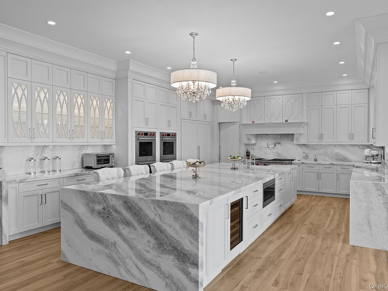 A spacious, open-concept kitchen features a stunning marble island with waterfall edges, offering ample seating for family gatherings and casual meals. Custom cabinetry in crisp white, adorned with elegant glass inserts and sleek silver hardware, provides generous storage and visual interest. Twin chandeliers add a touch of glamour, paired with soft recessed lighting throughout. Double ovens and modern appliances cater to busy households, while the warm undertone of the hardwood floors balances the cool, sophisticated feel of the marble and cabinetry. The layout ensures ease of movement and togetherness, making it ideal for both entertaining and daily family life.