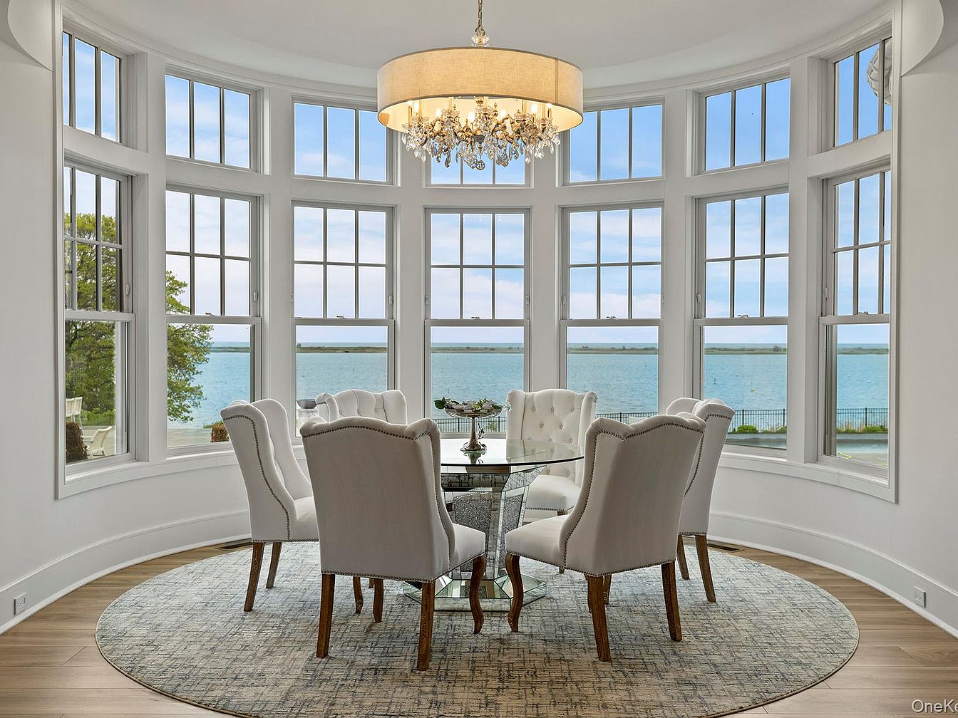 A stunning dining area is framed by expansive bay windows offering an uninterrupted panoramic view of the water, filling the space with natural light. Elegant tufted white chairs surround a circular glass-top table, promoting easy conversation and a sense of togetherness, perfect for family dining or hosting guests. The room’s neutral color palette, with soft grays and whites, complements the serene blue scenery outside. A sophisticated chandelier adds a touch of luxury, while the pale wood flooring and round woven rug create a welcoming and comfortable atmosphere suitable for gatherings and everyday family meals.