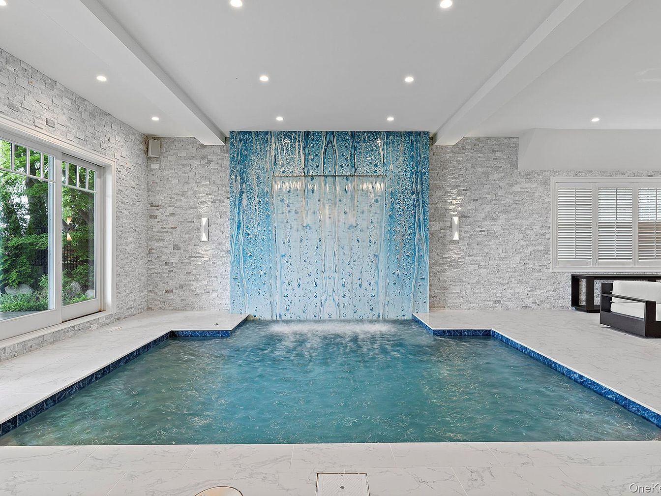 An inviting indoor pool takes center stage in this luxurious home retreat, featuring a striking blue glass waterfall as a dramatic focal point. Surrounded by white stone tile walls and expansive windows, the space feels open and airy, drawing in natural light and offering a tranquil view of the garden. Recessed lighting overhead enhances the serene atmosphere, while ample deck space provides room for seating and relaxation. The pool’s shallow ledges invite family playtime and safety, making it ideal for all ages. Neutral tones and modern lines offer a timeless, family-friendly aesthetic that blends relaxation with sophistication.
